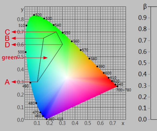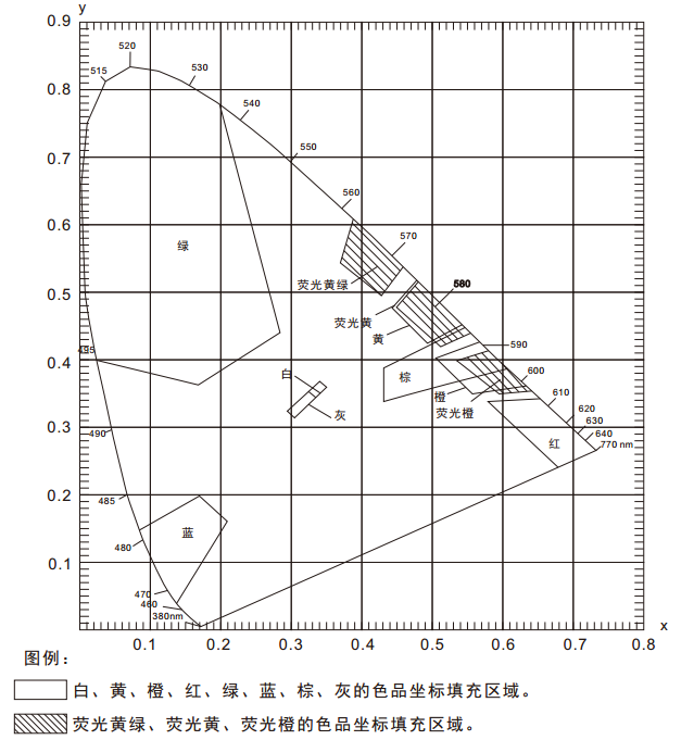 在《GB 2893安全色》、《GB/T 18833道路交通反光膜》等相关标准中,通常给出一块颜色区域(多个色品坐标点)和亮度因数要求,在D65/A光源和45/0几何条件下,判定样品是否落在对应的颜色区域内,借此判定样品是否满足标准规定的色度要求。由于颜色区域为多边形,如下图所示,导致使用普通的分光测色仪无法完成判定。NS808测色仪配合SQCT软件的交通路标测量模块则可以轻松解决这方面的问题。