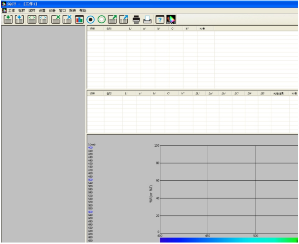NS808的交通路标测试模块主要是通过上位机软件SQCT配合NS808仪器实现的。使用前需先安装好SQCT上位机软件,再连接NS808仪器,然后打开上位机软件,默认为普通测试界面,如图1所示,在该界面下可以完成CIE L*a*b、XYZ、ΔE*ab、ΔE*cmc、ΔE*00等色度数据的测试,详细菜单和工具栏的介绍请参照该软件自带“色彩管理控制软件使用说明书”,这里重点介绍交通路标测试模块。
