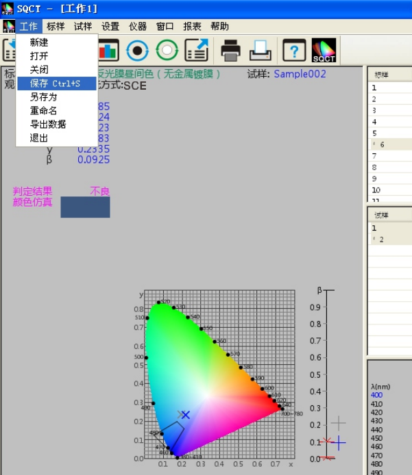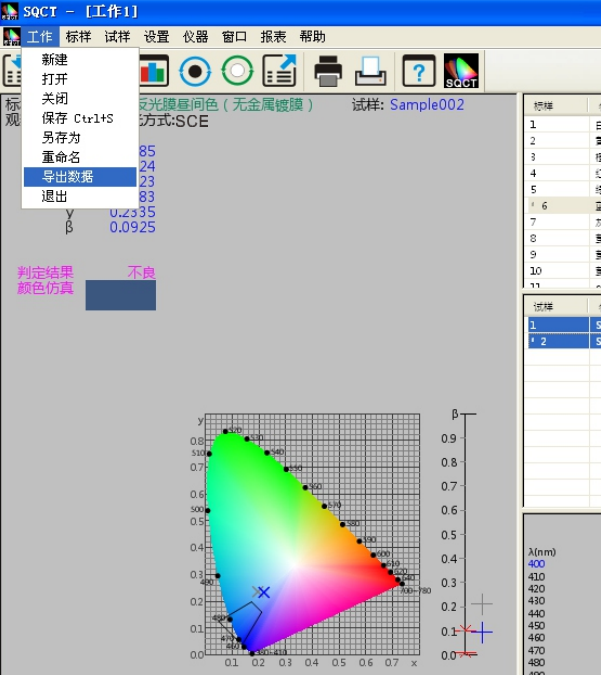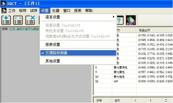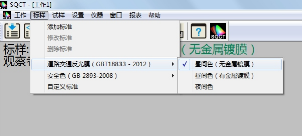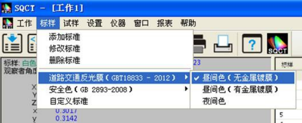 SQCT直接将《GB/T 18833-2012道路交通反光膜样》的多边形颜色区域做入软件中,可以直接从菜单中选择,“标样->道路交通反光膜GB/T 18833->昼间色(无金属镀膜)”如图11所示。