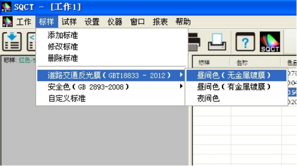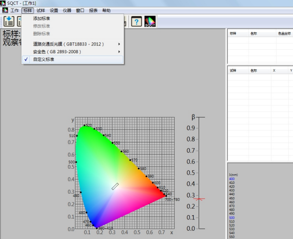 针对国内交通路标使用较多的标准GB/T 18833,SQCT软件将该标准中的标准色域纳入其中,客户只需根据自己需要进行选择即可。