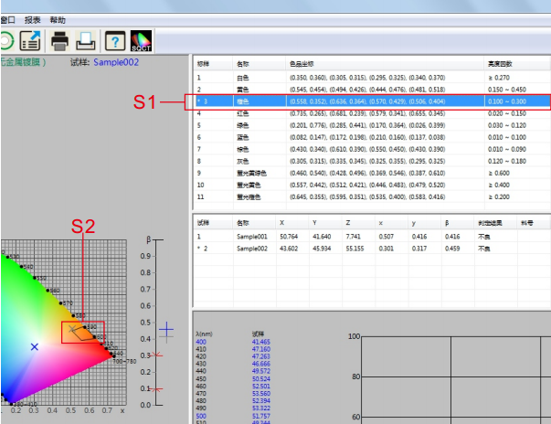 双击标样区域的蓝色,如图12中是S3所示部分,使蓝色为当前标样,蓝色多边形-容差标样(《GB/T 18833-2012道路交通反光膜样》规定的蓝色区域)则显示在S4部分。