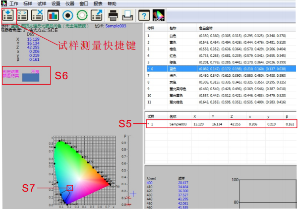 将测试样品放在NS808测量口径上,贴紧,鼠标点击试样测试快捷工具,如图13所示。大约1.5秒时间,完成测试,测试数据如图13中S5所示,在色品坐图中的位置如S7所示,仿真及判定结果如S6部分所示。