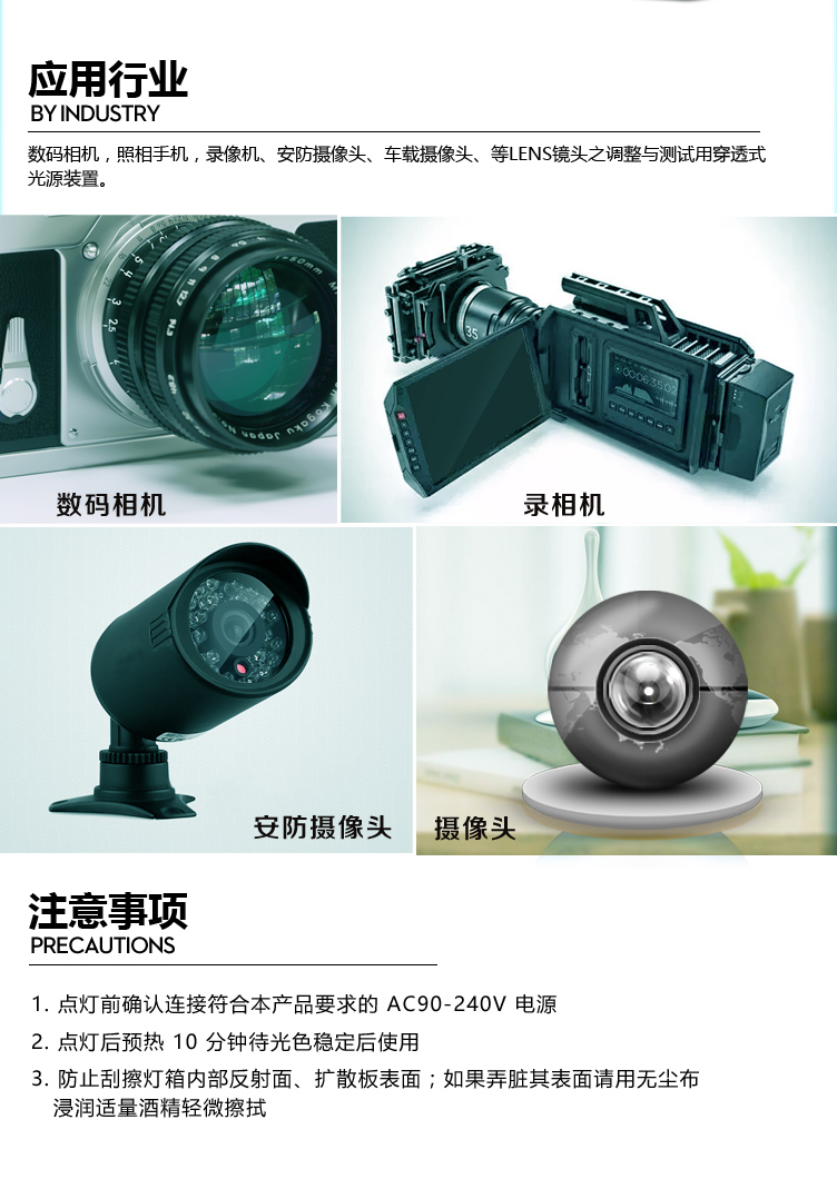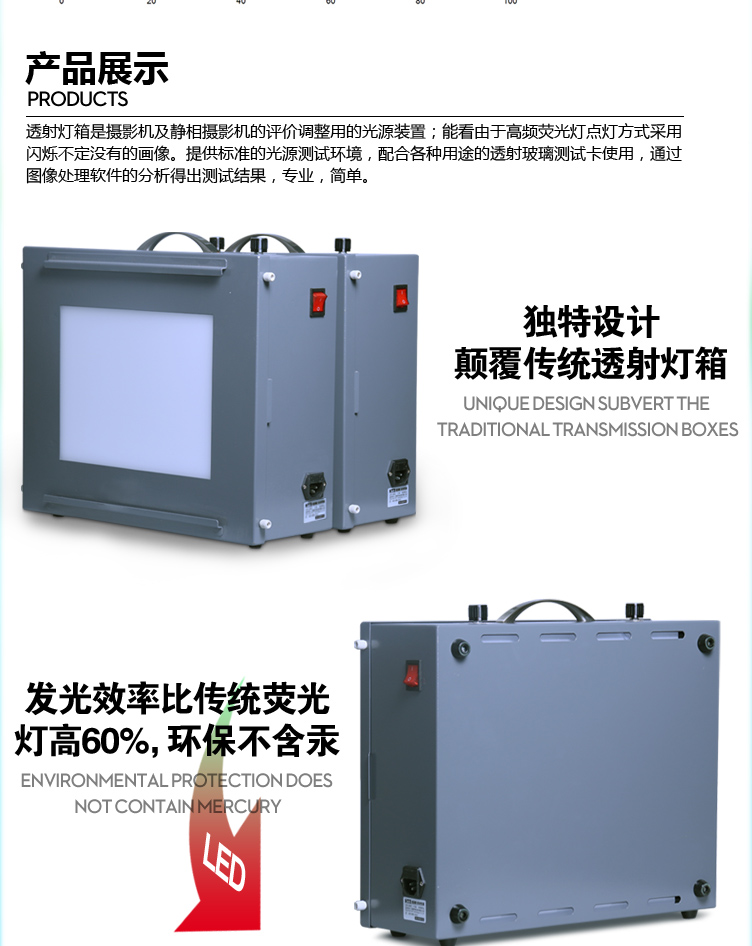 透射灯箱是摄影机及静像摄影机的评价调整用的光源装置,提供标准的光源测试环境,配合各种用途的透射型测试卡使用,通过图像处理软件的分析得出测试结果,专业、简单。