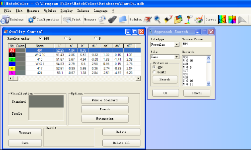 如果在色库中已经存储了许多过去曾经做过的颜色,使用这个功能,系统就能在色库中寻找同标准色接近的颜色,并且把寻找到的颜色按照色差值由小到大进行排列,显示出来。
