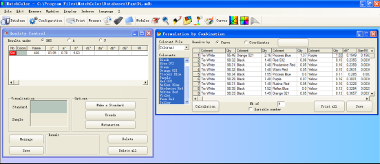 首先选择正确的色料数据库,然后点击计算按钮。这时软件就会自动地对色料数据库中的色料进行组合,计算出各种可能的配方,然后把更好的20个配方按照色差由小到大的顺序显示出来。