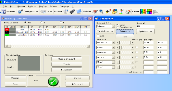 测试标准色和对比色,给出两个颜色的绝对值(L*、a*、b*)、色差数据(dL*、da*、db*、dE*),根据软件设定的色差范围,自动得出“通过/失败”结论。